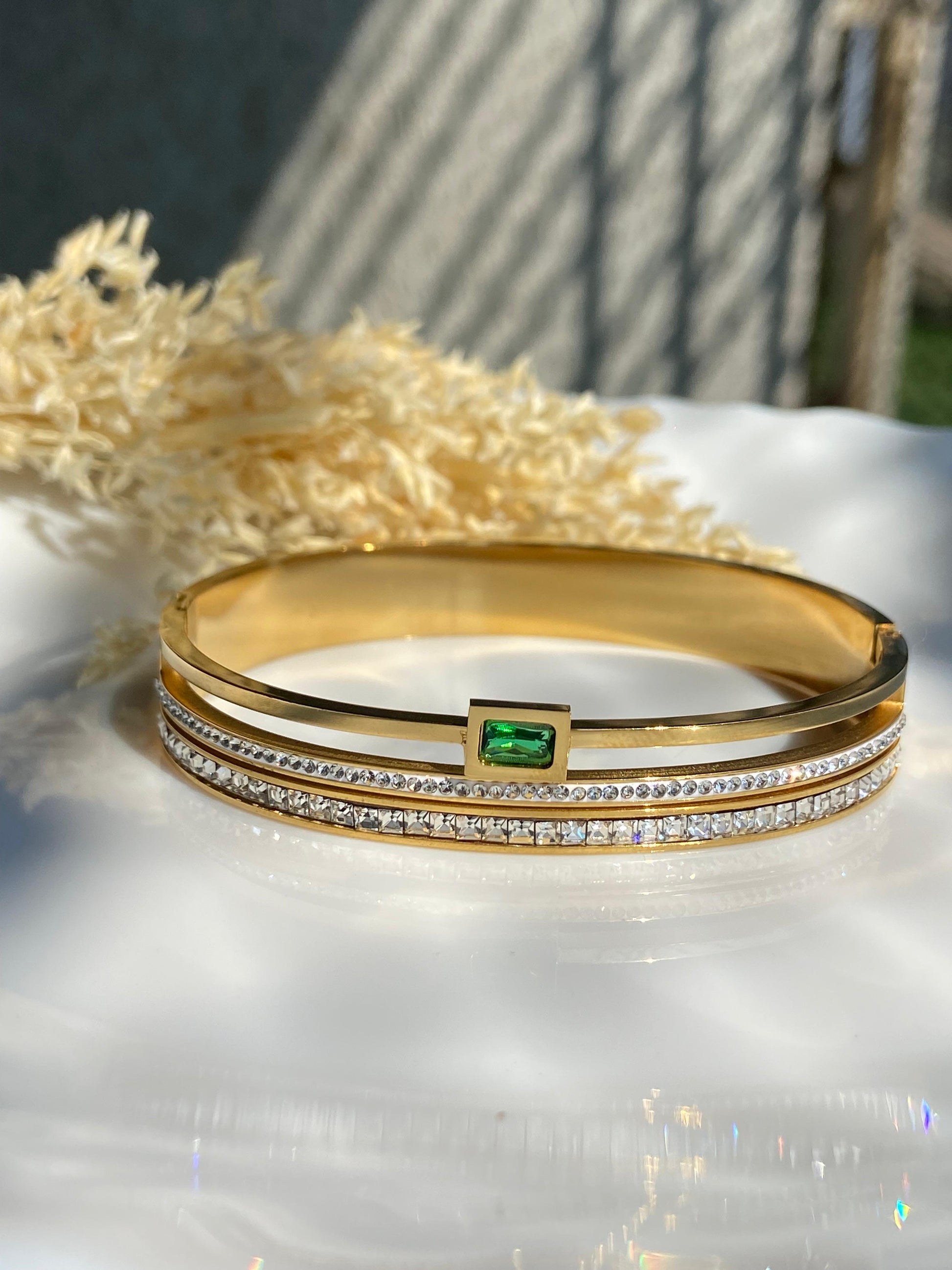This Elegant Emerald Centerpiece Gold Diamond Bangle brings together luxury and sophistication in one timeless design. Crafted with a polished gold-plated finish, the bracelet features a graceful three-layer band adorned with two rows of sparkling diamond-cut stones that catch the light beautifully.